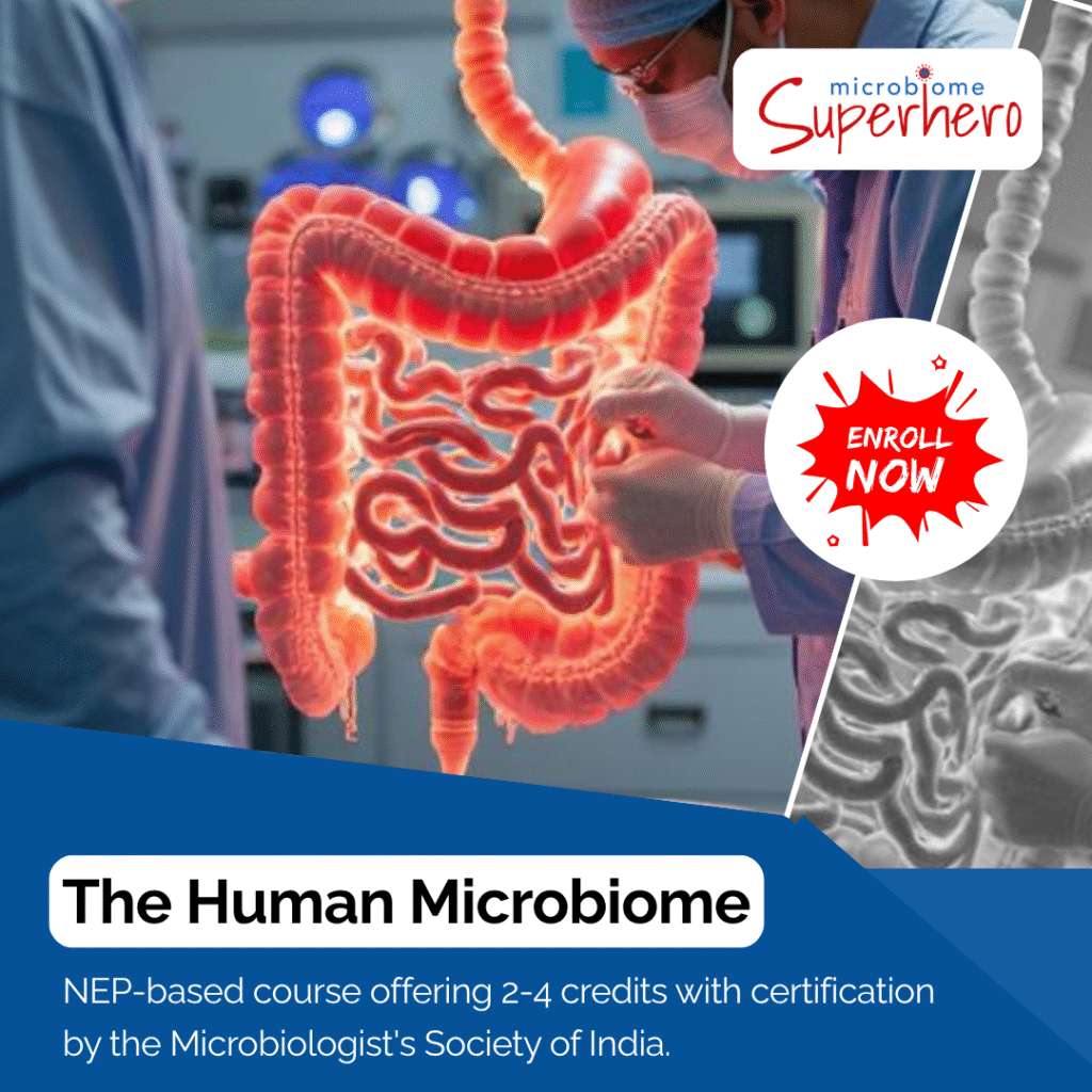 NEP-based course offering 3-credit points for all life sciences students with a basic knowledge of Microbiology and the techniques used, and covers the basics of the human microbiome, its components and how we acquire the microbiome. This course can also be taken as a certificate course by students of Medicine.