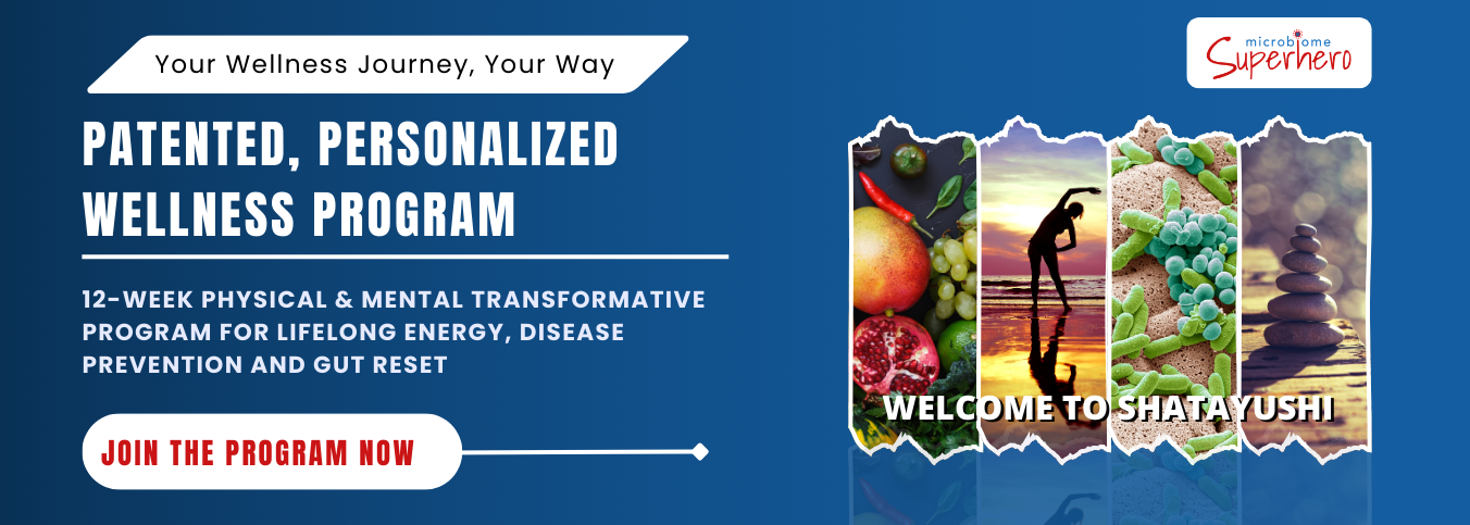 Shatayushi™ is a range of copyrighted, personalized wellness programs rooted in gut microbiome science. By improving the balance of your gut bacteria, we help you reset digestion, boost energy, enhance sleep, and support mental and emotional health. With expert-led guidance in nutrition, movement, and mindfulness, this unique journey empowers you to build lasting health from the inside out.